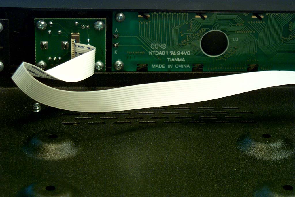Flexi-cable is used to connect from the main board to a small PC board holding the rotary encoder knob (shown on left). Another flexi-cable is used to connect from the main board to the PC board forming the button contacts and holding the LEDs. A standard ribbon cable is used to connect from the main board to the LCD. Lastly, shielded wire is used to connect from the main board to the headphone jack.