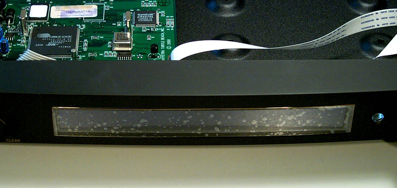 The front panel sports an array of "rubber chiclet" buttons, some of which have LEDs behind them (e.g. 'Play' and 'Stop'). Some of the other buttons have LEDs above them. Also visible is the 1/4" stereo headphone jack. Next, we see the 40x2 character liquid crystal display. This is a standard Hitachi HD44780 controller compatible display using a 14-pin interface. The bubbly looking stuff on the LCD is the protective sheet, which I have not yet pulled off of this unit. On the right, the encoder knob is shown. The knob is detented and has a pushbutton that is used to perform actions. The clear window next to the knob exposes an infrared receiver so that it may receive IR codes from the remote control.