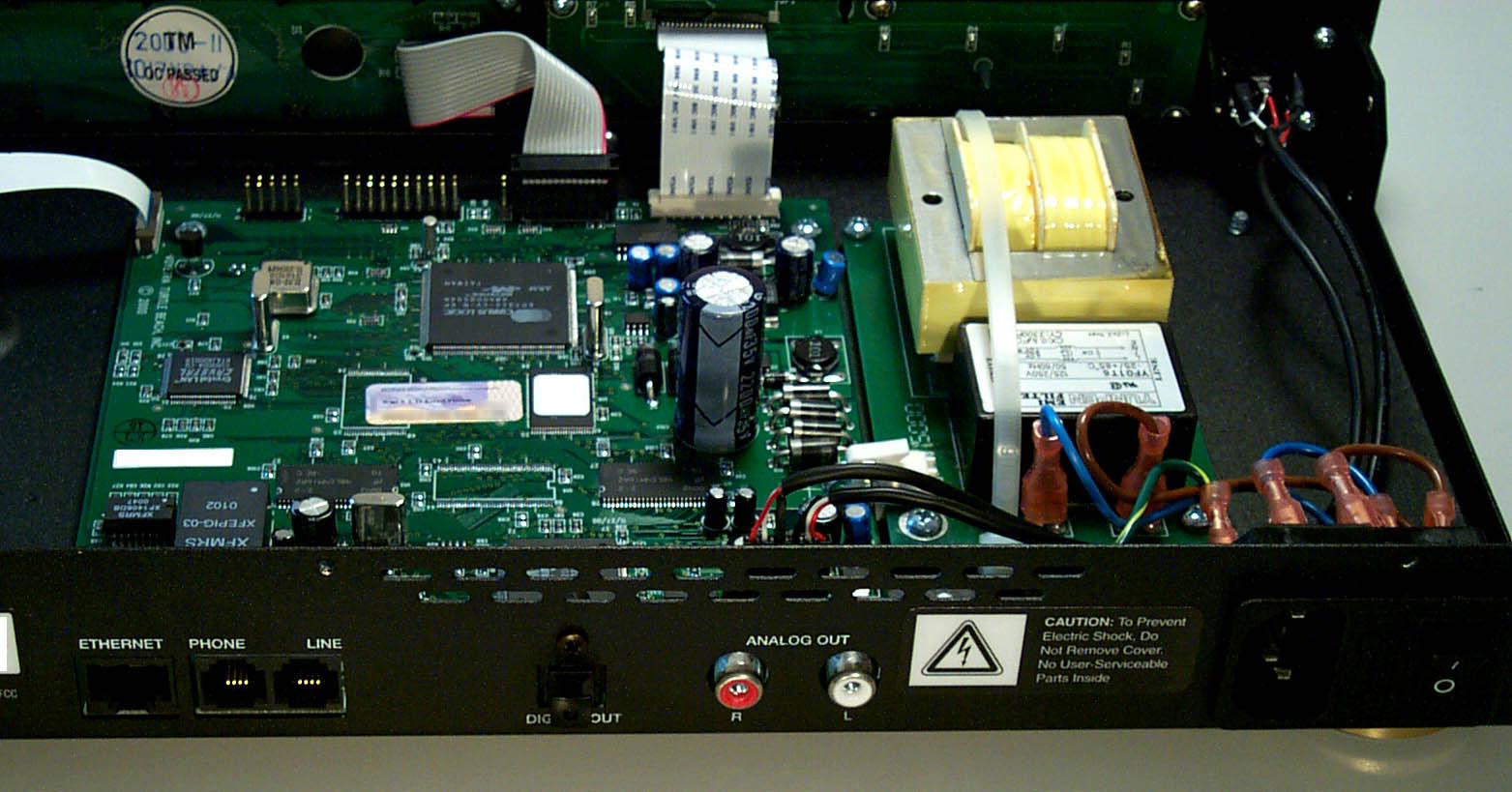 Swinging around to the back of the unit, we see (from left to right): the 10baseT ethernet jack, the HPNA interfaces, the TOSlink digital output, the analog audio outputs, an IEC power entry, and finally the power switch.